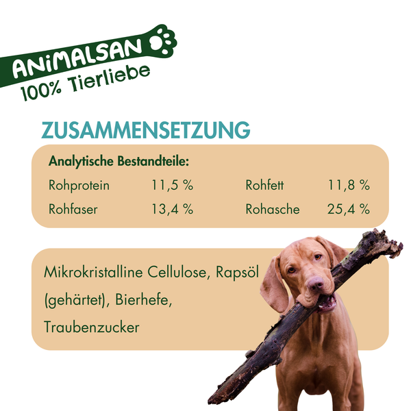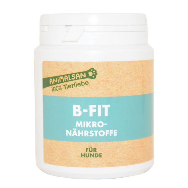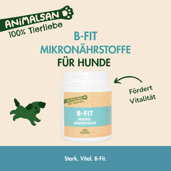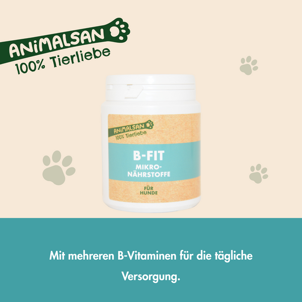 Manche Tage sind einfach voller Leben – und dein Hund braucht eine zuverlässige Versorgung mit wichtigen Nährstoffen. Animalsan B-Fit wurde entwickelt, um die tägliche Fütterung deines Hundes gezielt mit einem hochdosierten B-Komplex zu ergänzen. Die Tabletten enthalten Vitamin B1, B2, B5, B6, B12 und Folsäure in abgestimmter Rezeptur – ganz einfach als Leckerli oder übers Futter verabreicht.