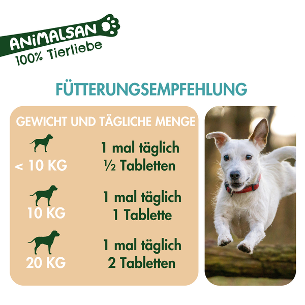1 Tablette pro 10 kg Körpergewicht täglich. Direkt als Leckerli geben oder unter das Futter mischen. Falls nötig, in etwas Leckerem verstecken.