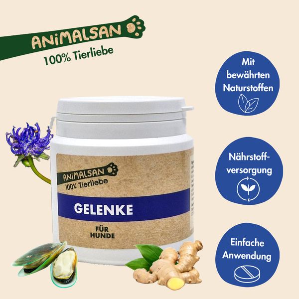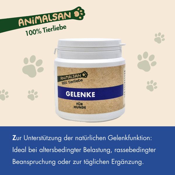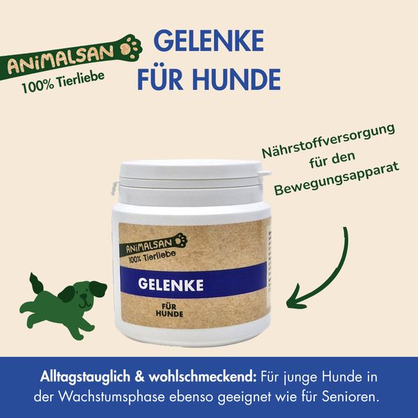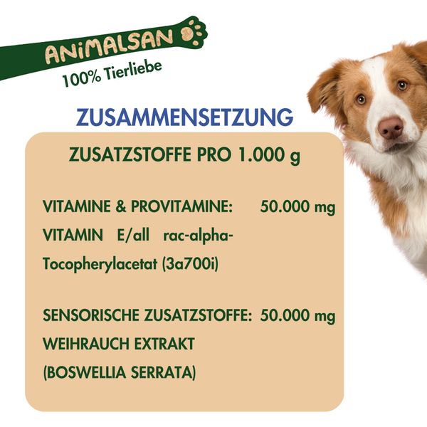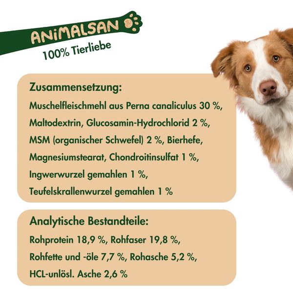 Animalsan Gelenke ist ein Ergänzungsfuttermittel für Hunde. Es ersetzt keine tierärztliche Behandlung. Bitte kühl, trocken und außerhalb der Reichweite von Kindern lagern.
