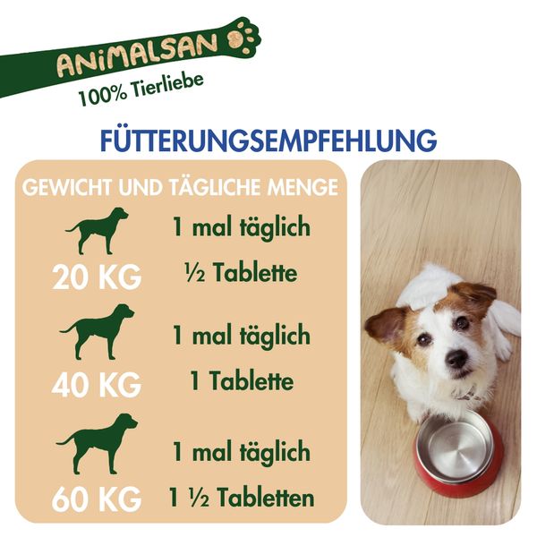 Täglich 1/2 Tablette pro 20 kg Körpergewicht. Direkt oder zerkleinert übers Futter geben. Die Anwendung ist für eine dauerhafte Fütterung geeignet.