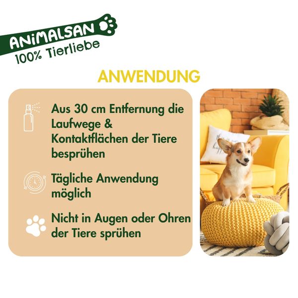 Täglich oder nach Bedarf die Laufwege und Berührungsflächen deines Tieres aus ca. 30 cm Entfernung besprühen. Bei empfindlichen Materialien vorab an unauffälliger Stelle testen. Nicht in Augen oder Ohren des Tieres sprühen.