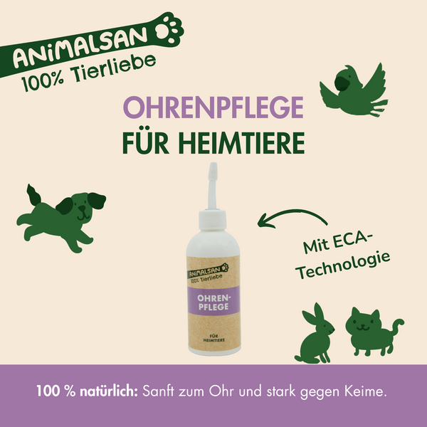 Saubere Ohren bedeuten Wohlbefinden – ganz ohne Reizungen oder aggressive Inhaltsstoffe. Animalsan Ohrreiniger wurde entwickelt, um die Ohren deines Hundes oder deiner Katze sanft zu reinigen. Die Lösung basiert auf der Elektrochemischen Aktivierungs- (ECA-)Technologie und ist wirksam gegen Bakterien, Viren und Pilze. Nach der Anwendung zerfällt sie rückstandsfrei in Wasser und Salz – für eine umweltfreundliche und hautschonende Reinigung. Der flexible Tropfer ermöglicht eine schonende Anwendung direkt im Gehörgang.